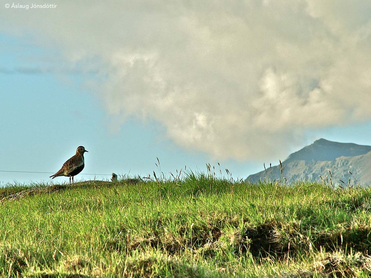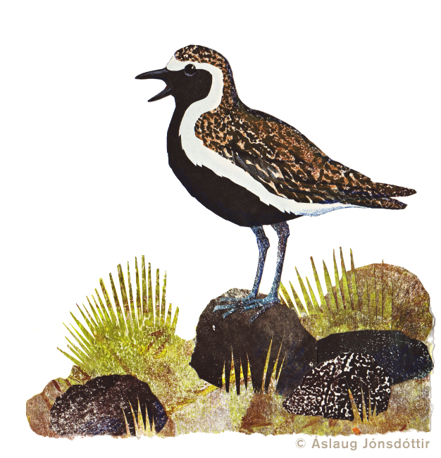 Photo Friday. When the first Golden Plover, Lóa, arrives to the island in the spring, it hits the news. And there have been several reports this week. I even thought I heard its mournful singing in Reykjavík today, despite the freezing rain. I knew I had a photo somewhere and even dug up an old illustration (1997) for a well-known rhyme about the coming of spring and singing of birds.