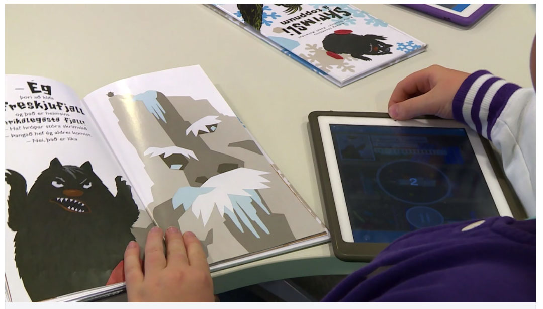 ♦ Reading: Sometimes authors and illustrators get requests about the use of their art for commercial purposes. Usually it is very easy to say a big NO! but on other occasions it is highly appropiate to grant the permission. In these two newly examples, the books about the two monsters are used to promote reading. A cover photo for handbook on reading (Er þetta stafurinn minn?) shows kids reading books from the monster series. And the books are also used in a video and on a homepage for an app called BookRecorder – an app that makes it easy for kids, teachers, parents and grandparents to record their own audiobooks. The application is available here.