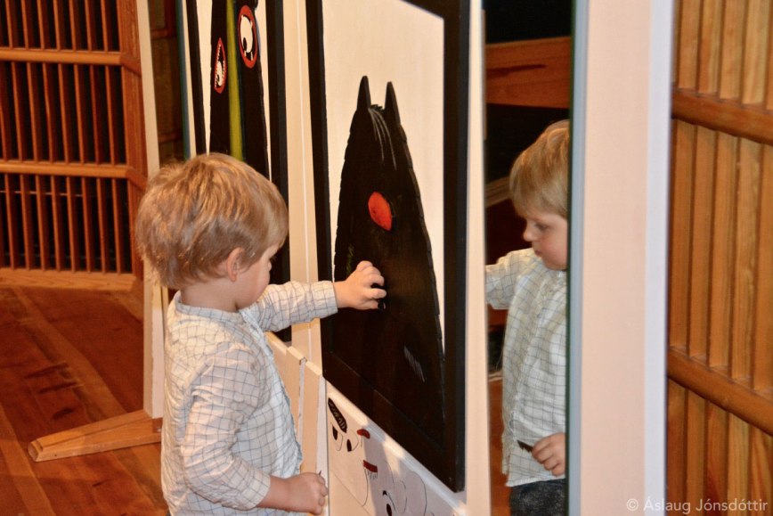 Myndirnar sem hér fylgja eru frá opnunardeginum í Norðurlandahúsinu, en börn og fullorðnir virtust una sér afar vel í skrímslaheiminum og nutu samvista við lestur og leik. Það gladdi að sjá því meginmarkmiði sýningarinnar náð.