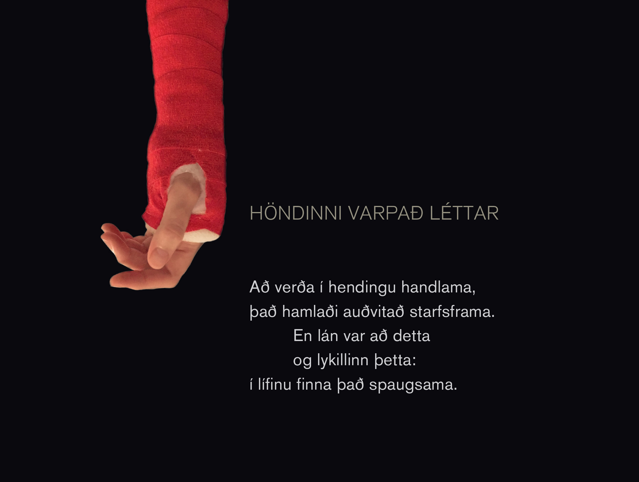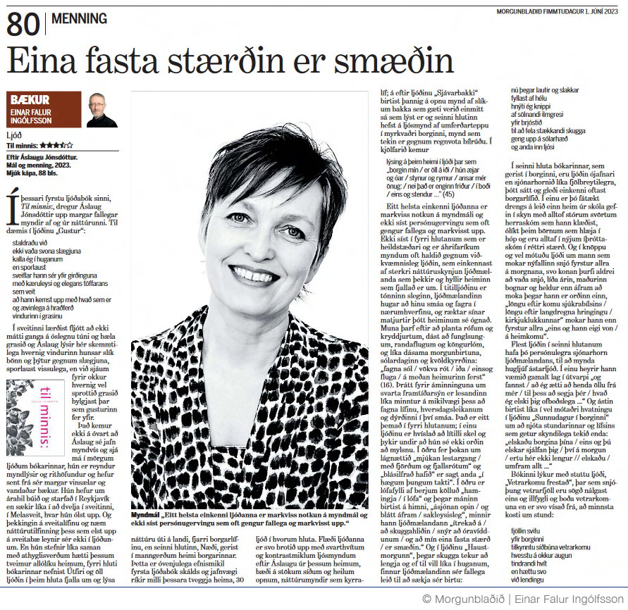Um leið og ég þakka fyrir verðlaun og viðurkenningu óska ég Kópavogsbúum og nærsveitafólki til hamingju með Daga ljóðsins. Það er einnig ástæða til þess að benda á glæsilega heildarútgáfu á ljóðum Jóns úr Vör sem Dimma gefur út í tilefni aldarafmælisins og óska aðstandendum til hamingju með skínandi fallega prentgripi og vandað verk.