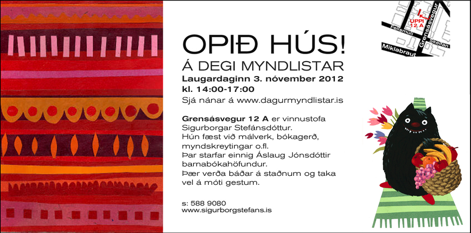 ♦ Day of the Art. Open house at the studio in Grensásvegur on the Day of the Art. Paintings, books, book art and design by Sigurborg Stefánsdóttir and Áslaug Jónsdóttir.
