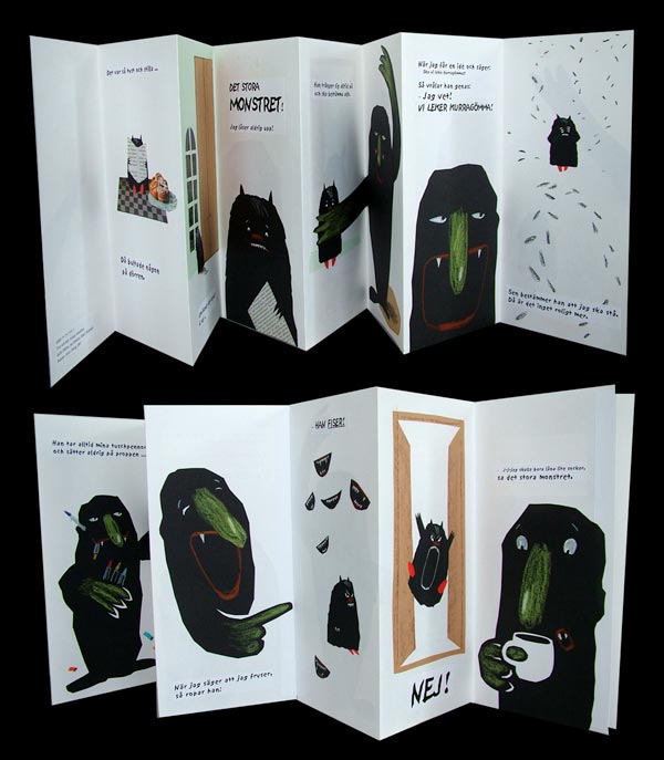 The two monsters were brought to live when the authors first met in 2001 at a workshop for Nordic authors and illustrators on the island Biskop-Arnö in Lake Mälaren in Sweden. The participants worked together in small groups, and one of the assignments was “There was knocking on the door”. The two monsters thus started as the Big Monster knocked on the Little Monster’s door. The first book: No! said the Little Monster, came out of the initial drafts the authors created at the workshop. It was published in 2004, simultaneously in their three languages but has since been published in many other countries.