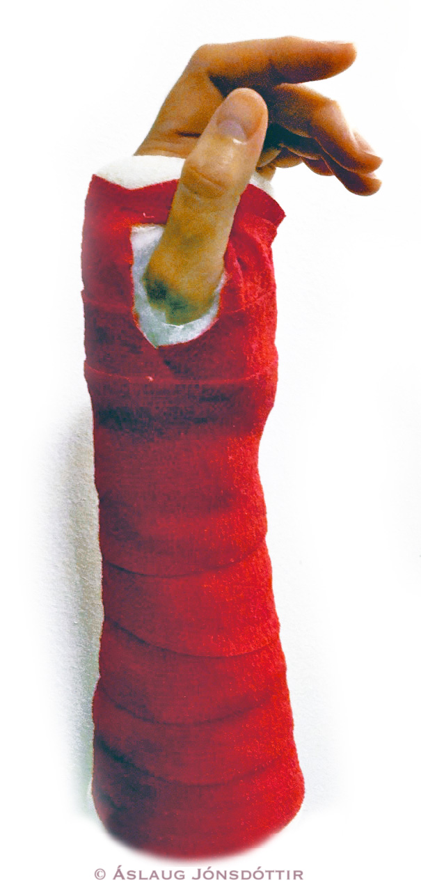 Þar sem ég horfði upp á þennan ónothæfa útlim sem ég þurfti að dragnast með og aðlagast eins og ókunnum aukahlut, þá gerði ég mér það til skemmtunar að dubba höndina upp í ýmis gervi og birta myndir af því á Instagrammi, þær fimm vikur sem höndin var í nauðsynlegum umbúðum. Þetta létti mér lund og viðbrögðin voru jákvæð. Skilyrðin voru að þessi „handavinna“ tæki skamman tíma, ég yrði að nota það sem væri „hendi næst“, ekki leggja í neinn kostnað heldur nota það sem væri í skúffum og skápum og ruslakistum. Það afhjúpast að ég geymi fáránlegustu hluti, mér finnst að allt muni vera hægt að nýta í sköpun á einhvern hátt.