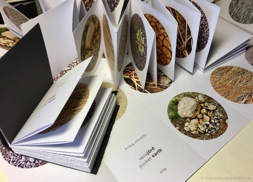 Below: jörð | earth (2017) – a collection of round shaped images, photographs of the surface of the land, of the ground: the earth. The seasons and the soil, the dirt under our feet, all what deserves to be valued and cherished and given time to observe. From the exhibition Borderland. A small version with same images (no-glue, no sewing, one-piece folding): vasajörð | pocket earth made in 2019. Exhibited at CODEX VII.