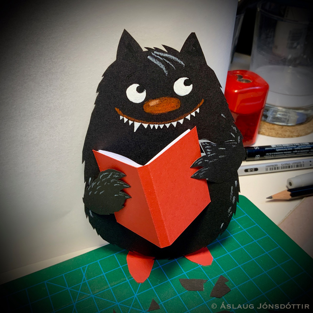 Today is the World Book Day so Little Monster (below) picked up a book to read. I am working on new illustrations for the next book in the book series about Little Monster and Big monster – and Furry Monster, so every day is a “Monster Day” at the drawing desk these days. The new book will be published in Icelandic, Swedish and Faroese this fall.