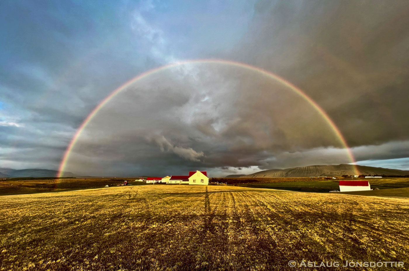 Föstudagsmyndir: Skýin, himinninn og hafið – allt er þetta endurtekið myndefni, en það er einfaldlega ekki hægt annað en dást að dýrðinni sem veðrabrigðin skapa. Skarðsheiði og Melaleiti undir regnboganum í ágúst.