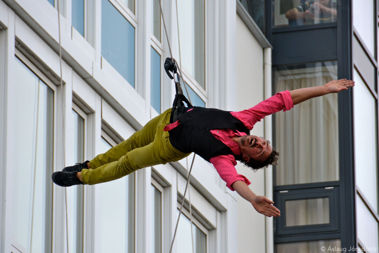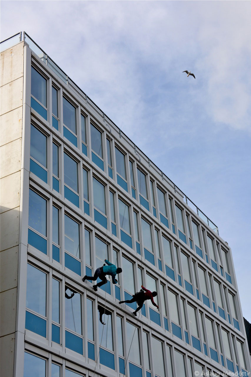 ♦ Photo FridayReykjavík Arts Festival 2015 started last week. The opening performance was a “perspective-bending“ dance act by BANDALOOP, who despite the cold swayed and swung most elegantly up and down the walls of Aðalstræti 6.