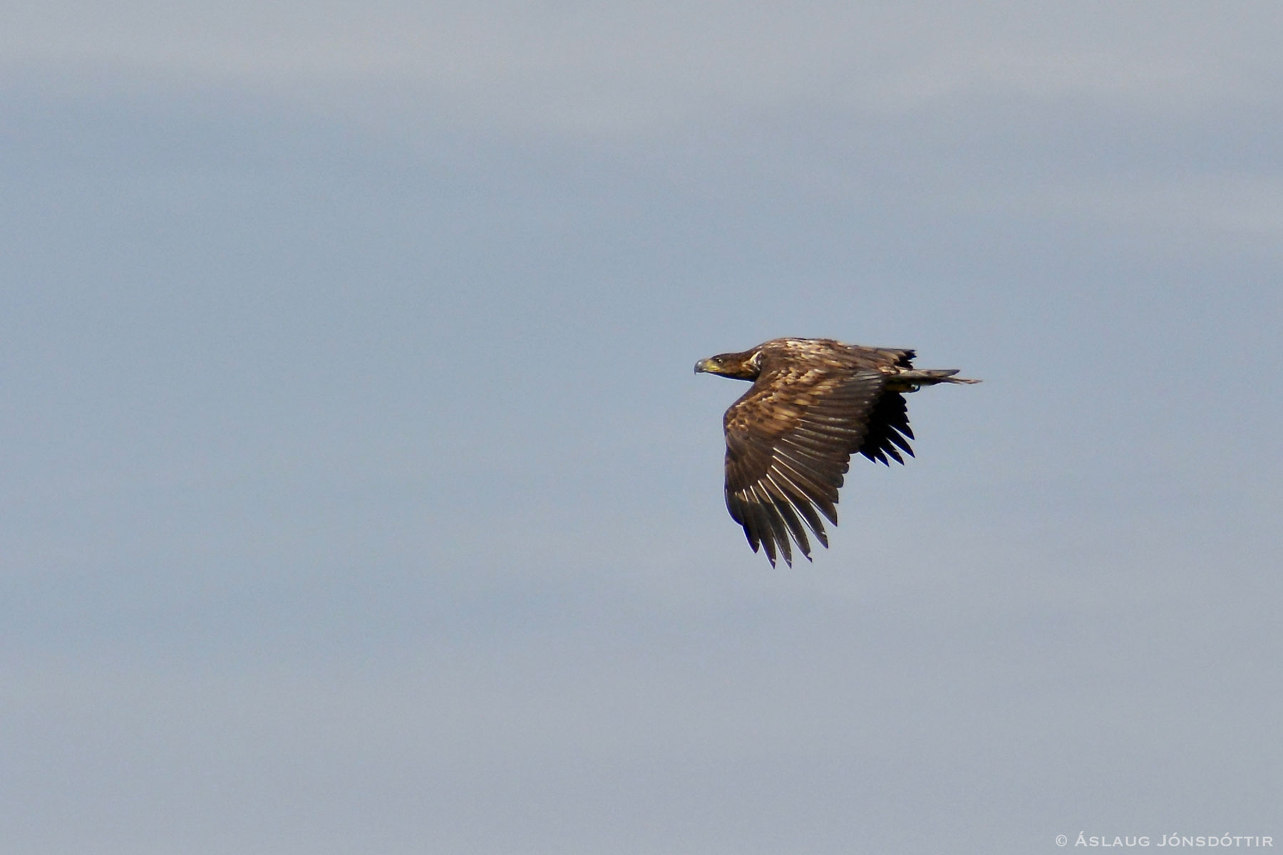 Styggðin sem kom að fuglum þar sem ég fór um var venju fremur mikil, en svo áttaði ég mig á því að ég væri ekki mesta ógnin á svæðinu. Þarna kom nefnilega aðvífandi örn með sínar löngu veiðiklær. Ég fleygði mér til jarðar ef ég mætti þannig vekja áhuga arnarins og mundaði linsuna. Örninn sveimaði yfir í tvígang.