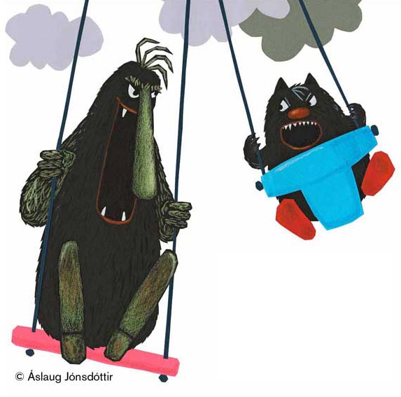 Jónsdóttir’s illustrations are suitably dark and dangerous, yet colorful elements pop up everywhere … The images also contribute a great deal to the story: when the brawl is over and the two monsters are friends again, the sun shines and a colorful rainbow burst out in the illustration. – Judith Sørhus Litlehamar / Pirion 8/2014