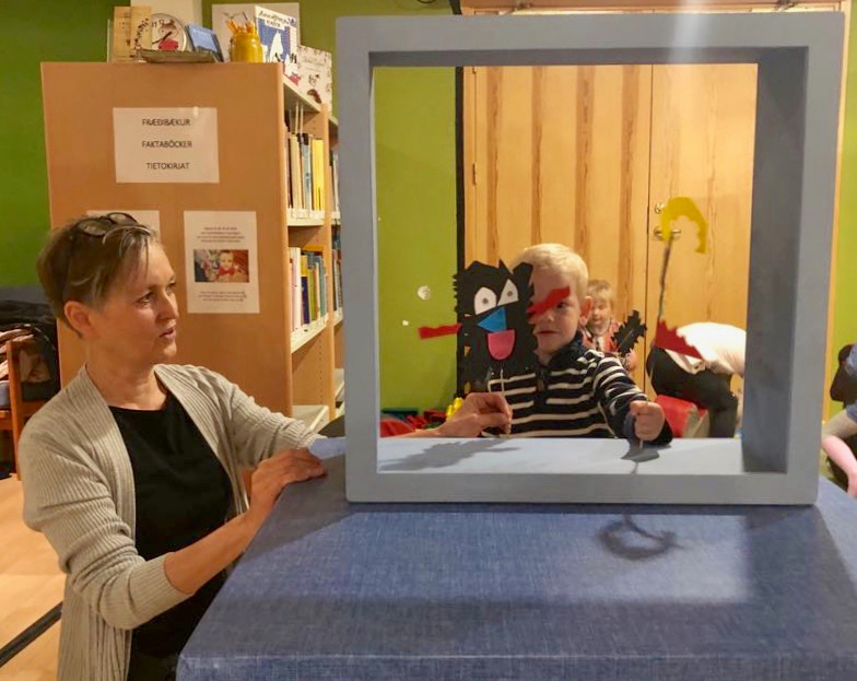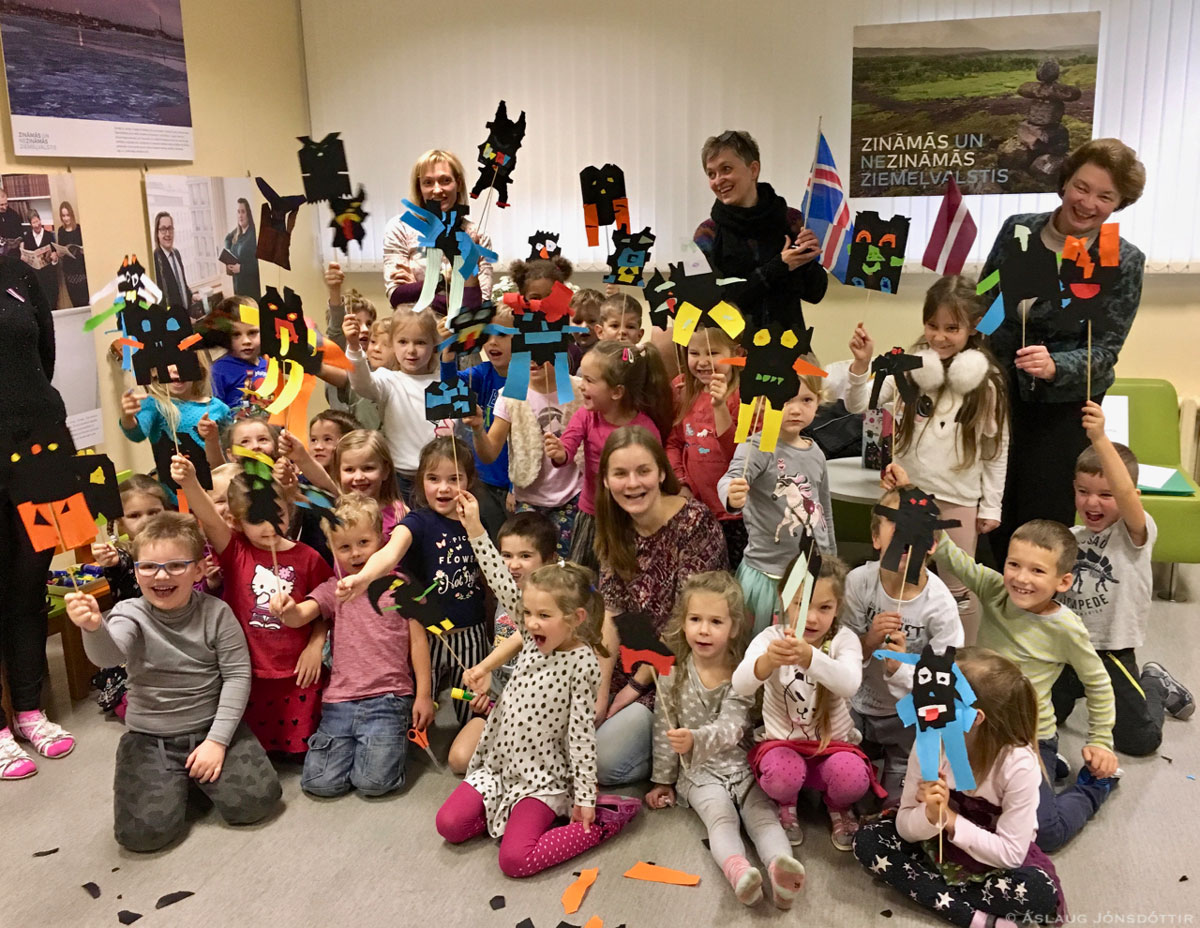Skrímslavinnustofur: Hér fyrir neðan eru myndir frá vinnustofu barnanna í Domdaris-skólanum íRīga. Krakkarnir sköpuðu og fjölbreytt skrímsli og gátu unnið áfram með sköpunarverkin sem einfaldar leikbrúður.